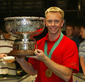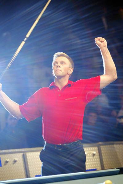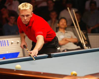 Ralf Souquet 1996. Im Finale gegen den Kanadier Alex Pagulayan war Thorsten Hohmann nie in Rückstand geraten. Mit 17:10 setzte sich der Deutsche am Ende sicher durch. Nachdem Hohmann mit 2:0 in Führung gegangen war, konnte Pagulayan zum 2:2 noch einmal ausgleichen. Dann aber zog Hohmann auf 12:7 davon. Eine kritische Situation musste er noch einmal überstehen, als Pagulayan wieder auf 10:12 herangekommen war. Im 23. Spiel verschoss der Kanadier dann aber die sechs und hinterließ Hohmann einen offenen Tisch. Danach ließ der neue Weltmeister seinen Kontrahenten nur noch zwei Mal an den Tisch. Im Halbfinale hatte Thorsten Hohmann für die größte Überraschung der Titelkämpfe gesorgt, als er Titelverteidiger Earl Strickland (USA) mit 11:4 klar und sicher ausschaltete. In der zweiten Begegnung der Vorschlussrunde hatte sich Alex Pagulayan mit 11:6 gegen den maltesischen Snooker-Star Tony Drago durchgesetzt. Die Hoffnungen von Thorsten Hohmann wären beinahe schon im Viertelfinale beendet worden. Dort stand er gegen den Vorjahresfinalisten Francisco Bustamente von den Philippinen am Rande einer Niederlage, rettete sich aber noch denkbar knapp mit 11:10. Ab dem Achtelfinale war Thorsten Hohmann der einzige Deutsche. Ralf Souquet war in der Runde der letzten 32 mit 3:9 in einem von vielen als vorweggenommenes Finale bezeichnetes Match gegen Ching-Shun Yang aus Taiwan gescheitert; Yang verlor später im Viertelfiinale gegen Earl Strickland. Strickland hatte zuvor in der ersten Finalrunde auch Thomas Engert mit 9:3 ausgeschaltet. Oliver Ortmann war in der Runde der letzten 64 mit 2:9 gegen Francisco Bustamente gescheitert. Christian Reimering, Thorsten Schober, Ralph Eckert und Michael Schmidt sind in Cardiff in der Vorrunde ausgeschieden. (Rolf Kalb) |